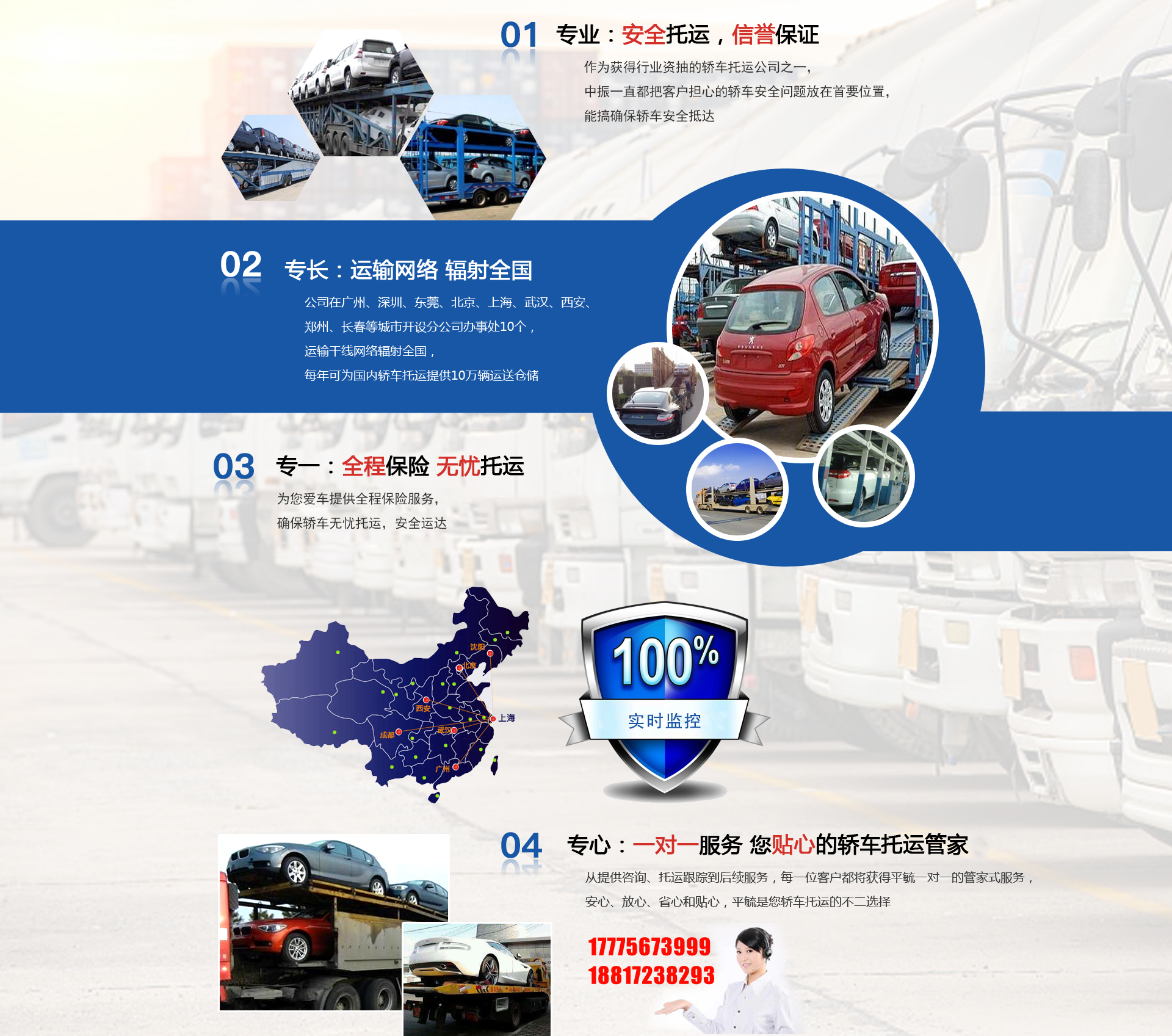 上海平毓物流有限公司:主要以試驗車巡展車、二手車、私家車、事故車、特大型疑難車型的托運業務,北京、沈陽、長春、哈爾濱快速到達。運價低,所運車輛全程保險,運輸車輛全部衛星定位。我們擁有一支強大的運輸隊伍,管理系統實行計算機網絡化,信息化管理。保證了快速、準確及時快捷的運輸任務。